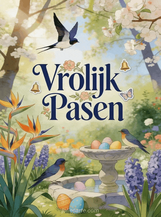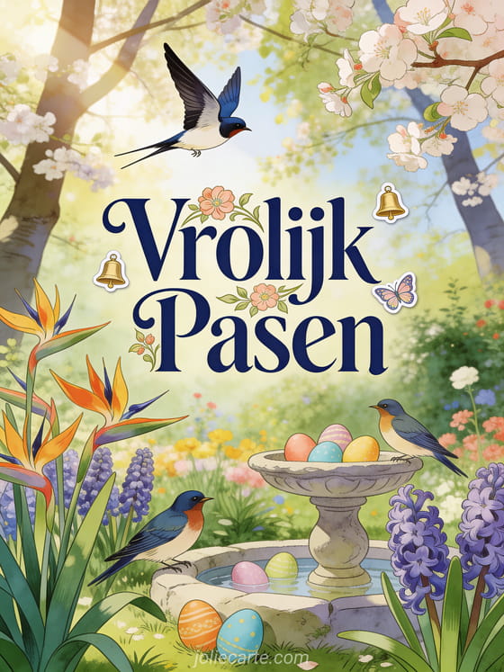 Stuur een verfijnde paaskaart in art nouveau-stijl met een zwaluw die soart boven een bloeiende lentetuin met paradijsvogelbloemen en hyacinten, met een stenen vogelbad omringd door kleurrijke paasei. Ontdek ook een pasen felicitatie of een kaart fijn paasfeest.