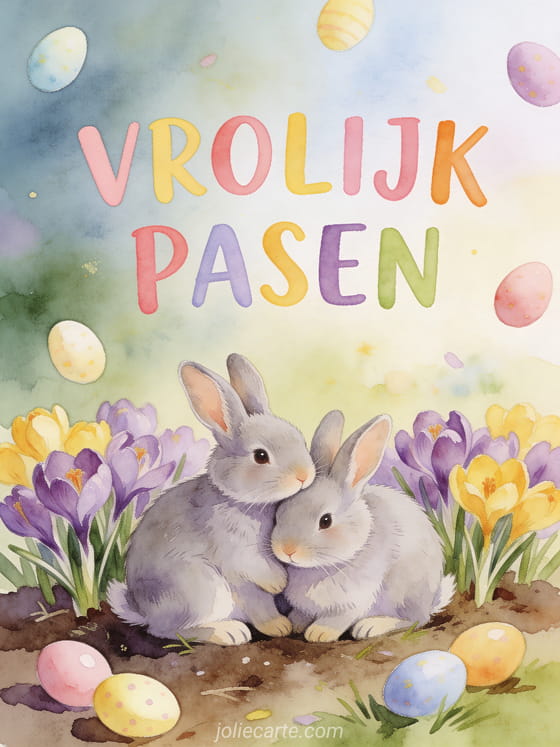Paashaas een tere paaskaart met twee kleine konijntjes tussen paarse en gele krokussen