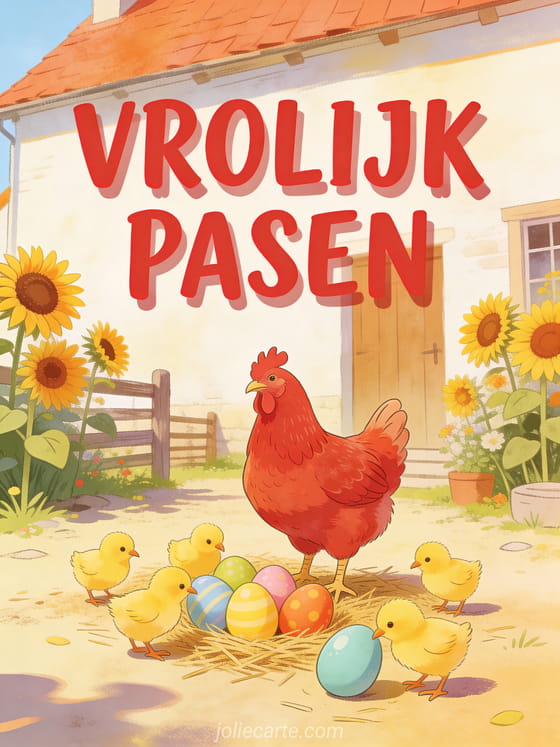 Paaskip een vrolijke paaskaart met een trotse rode kip en haar kleine gele kuikentjes
