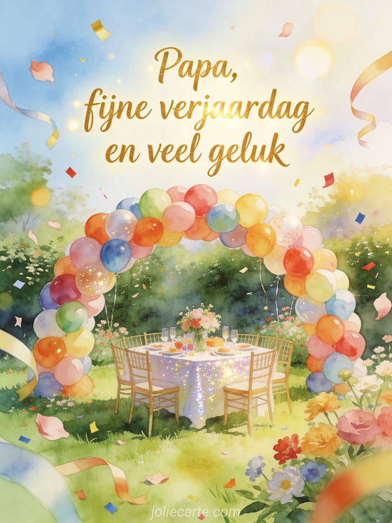 Stuur papa ik wens je een fijne verjaardag met verfijnde crèmekleurige tekst, een grote ballonnenboog rond een fonkelende verjaardagstafel in een zonnige tuin, plus bloemblaadjes, linten en confetti over de rand. Ontdek ook een fijne verjaardag papa kaart, gefeliciteerd met je verjaardag papa geanimeerde afbeeldingen of een verjaardagsgedicht papa kind.
