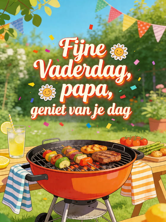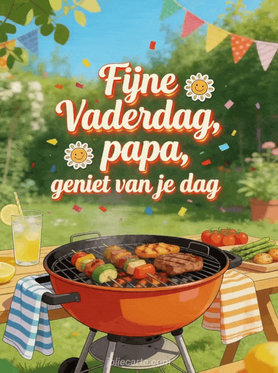 Wens papa een zonnige dag met een levendige illustratie van barbecue, limonade, geroosterde groenten en feestelijke slingers in de tuin. Stuur ook fijne vaderdag mijn lief, een vaderdagkaart voor papa of een gratis afbeelding vaderdag.