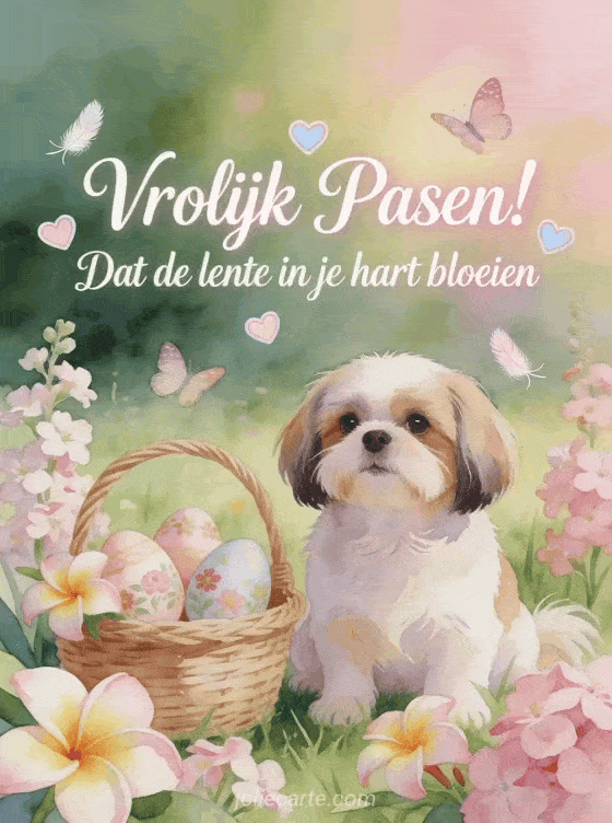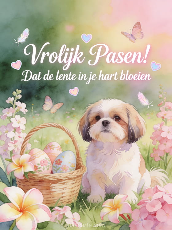 Stuur een prachtige paaskaart met een shih tzu in een veld van frangipani en vlambloemen met een gevlochten paasmand en beschilderde paasei, met vlinders die dansen in de warme lentelucht. Ontdek ook een kaart fijn paasfeest of een tekst paaskaart wensen.