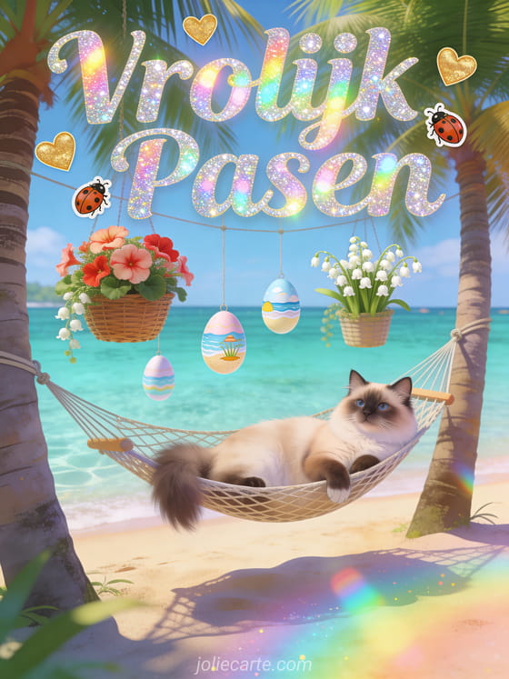 Stuur een levendige paaskaart met een Birmaanse kat liggend in een hangmat gespannen tussen twee palmbomen op een tropisch strand, begonia's en lelietjes-van-dalen in hangende manden en paasei versierd met strandmotieven zwaaiend zacht. Ontdek ook een geanimeerde kaarten pasen of een vrolijke pasen kaart.