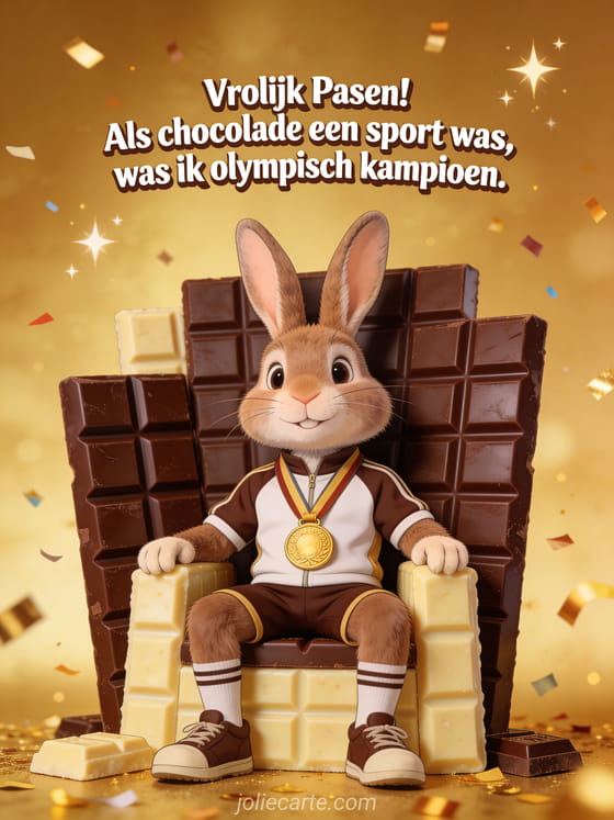 Stuur een humoristische paaskaart voor volwassenen met een chocolade-olympiër konijn. Ontdek ook een grappig vrolijk pasen humor of een humor grappig humor vrolijk pasen.