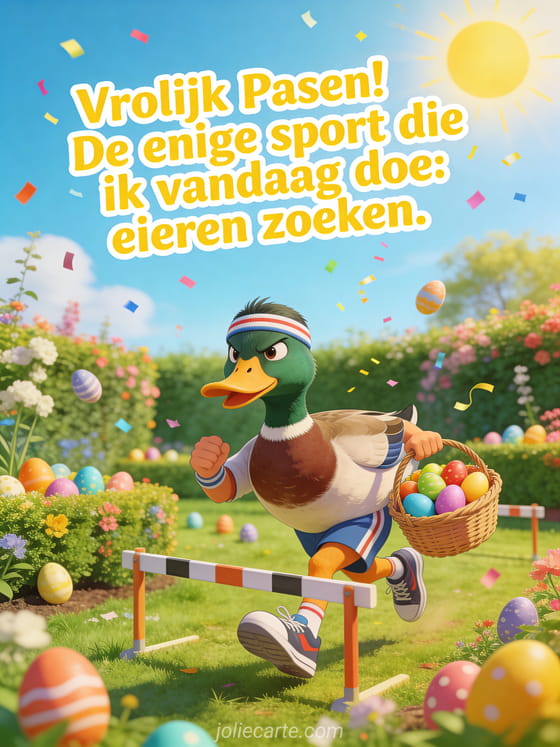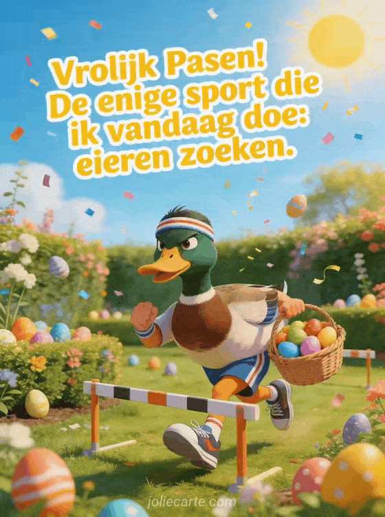 Stuur een humoristisch Pasen-gif met een eend in sportkleding die eieren razendsnel zoekt in een lentetuin. Ontdek ook een fijne paaszondag humor of een grappig vrolijk paasfeest.