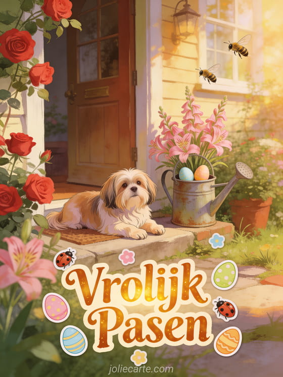Stuur een warme paaskaart met een lhasa apso liggend op een dorpsstoep omringd door stokrozen en alstroemeria, een vintage gieter met paasei en zoekende bijen in het gouden middaglicht. Ontdek ook een paasfeest kaart of een pasen felicitatie.
