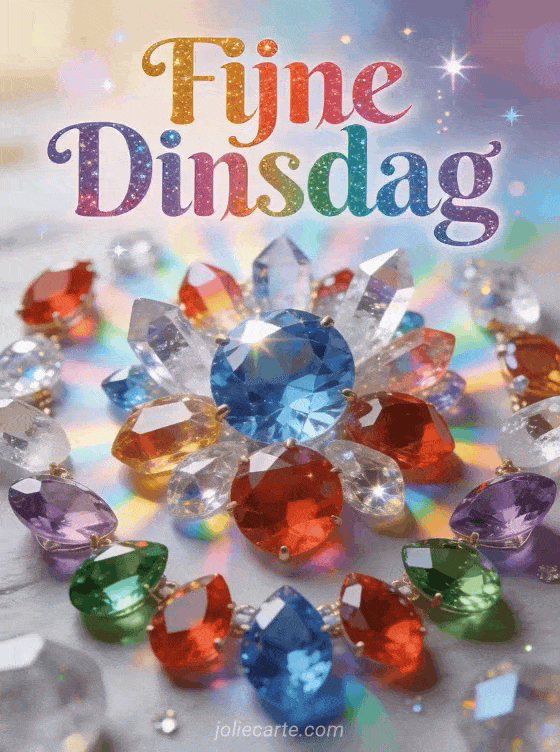 Stuur een schitterende fijne dinsdag picmix groet via deze gratis wenskaart. Een betoverende display van kleurrijke edelstenen en kristallen met regenboog lichtreflecties, een magische glinsterende schat sfeer met prismatische effecten en briljante vonkelende juwelen. Bekijk ook een gif fijne dinsdag vrouw of een hele fijne dinsdag kusjes.