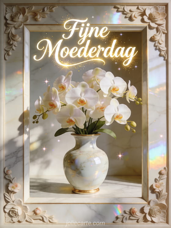 Deel een verfijnde Moederdagkaart met een porseleinen vaas, stralende orchideeën, marmeren weerspiegelingen en een sierlijke feestelijke gloed. Ontdek ook een tekening voor Moederdag, lieve woorden voor Moederdag of een fijne Moederdag kaart.