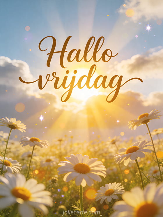 Deel een positief hallo vrijdag met deze lichtgevende kaart vol zon en goede energie. Ontdek ook fijne vrijdag koffie, fijne vrijdag fijne dag of goedemorgen fijne vrijdag.