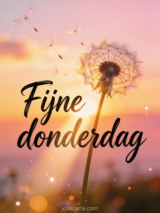 Deel een positieve fijne donderdag-citaat met een lichtgevende paardenbloem die zaadjes loslaat in de zonsondergang. Stuur meer zachte inspiratie met fijne donderdag afbeeldingen met rozen, fijne dag op donderdag afbeeldingen of fijne donderdag positief.