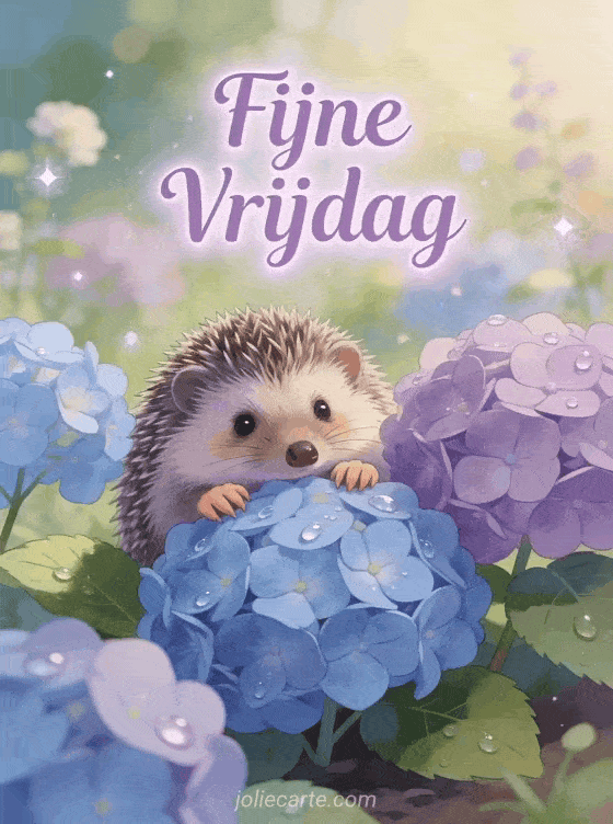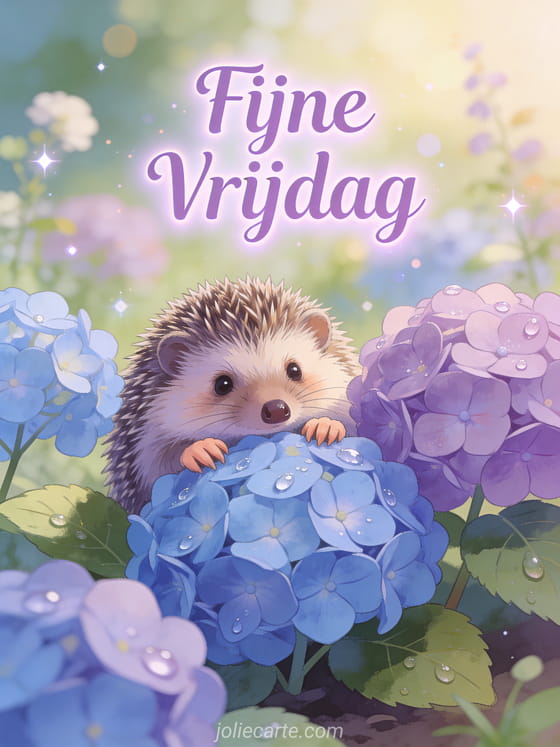 Stuur een vredige vrijdag- en weekendgroet met een schattige egel genesteld tussen blauwe en paarse hortensia's in een rustige tuin. Bekijk ook een fijne regenachtige vrijdag of een bericht om een fijne vrijdag te wensen.