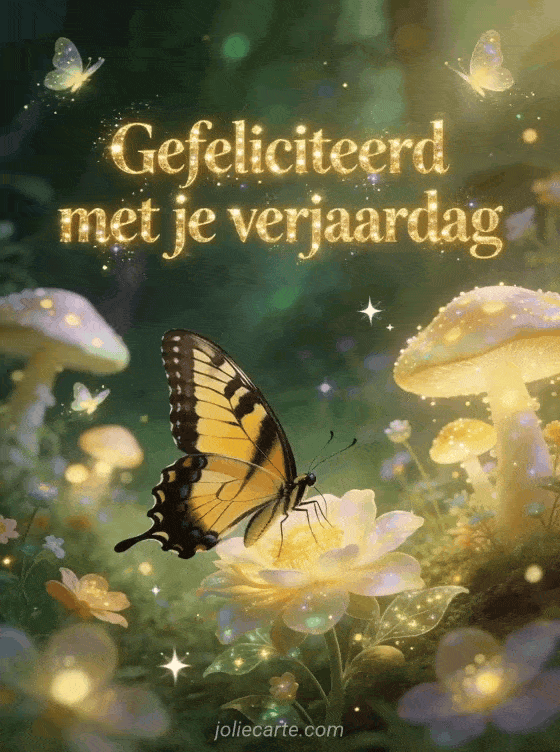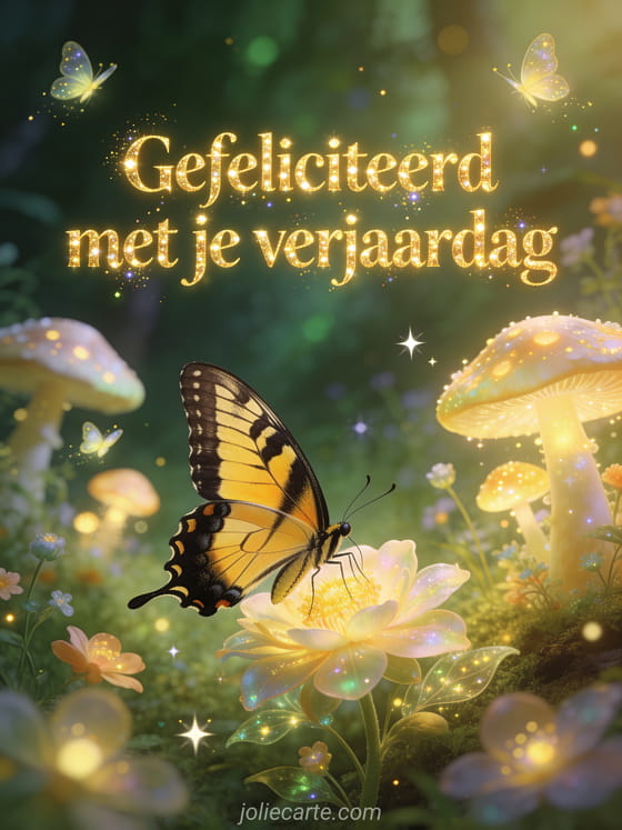Verras met deze betoverende verjaardagskaart met een prachtige koninginnenpage vlinder in een verlichte sprookjesachtige open plek. Ontdek ook een verjaardagskaart rozen of een verjaardagskaart jongen.