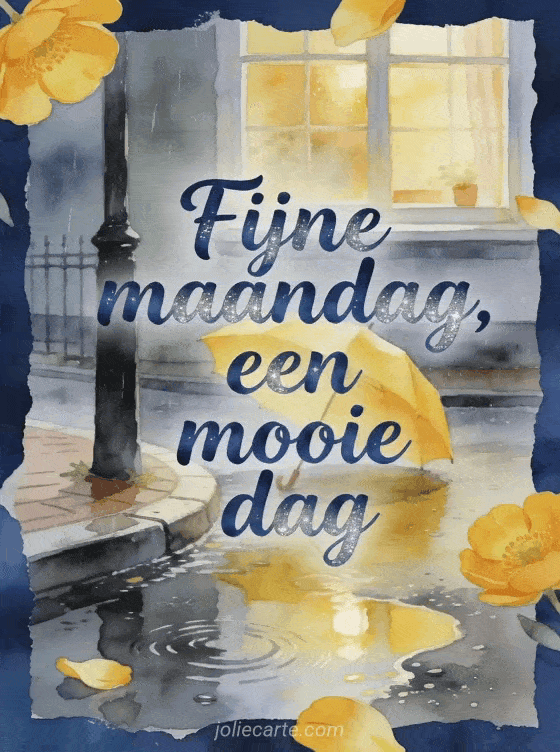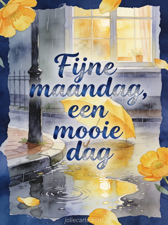 Stuur een troostende fijne maandag groet met diepblauwe aquarelletters, zilveren sprankels, een regenachtige straathoek, een gele paraplu, glanzende plassen, boterbloemblaadjes en warm raamlicht. Deel ook goedemorgen fijne maandag afbeeldingen gif, goedemorgen fijne maandag gif of mooie afbeeldingen om een fijne maandag te wensen.