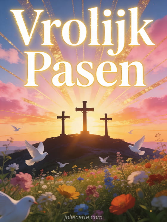 Stuur een grandiose religieuze Pasen-afbeelding met drie kruisen op Golgotha bij een spectaculaire dageraad. Ontdek ook een katholieke pasen afbeelding of een vrolijk pasen religieus.