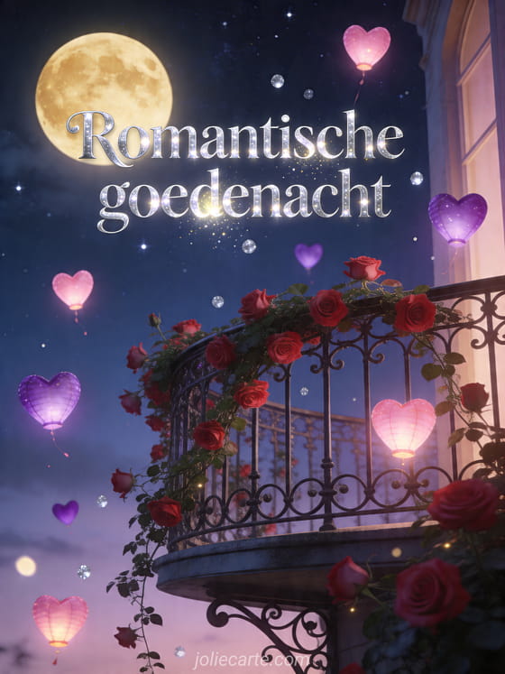 Wens een magische nacht met deze gratis romantische goedenachtkaart met rozen, maanlicht en stralende hartjes boven een balkon. Ontdek ook stel kusjes in het water, liefdeskusjes hart hart gif of sms liefde dikke kusjes.