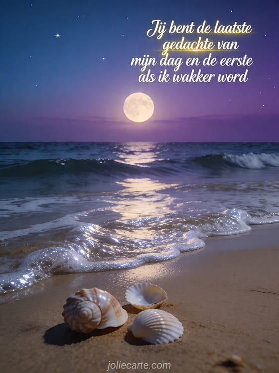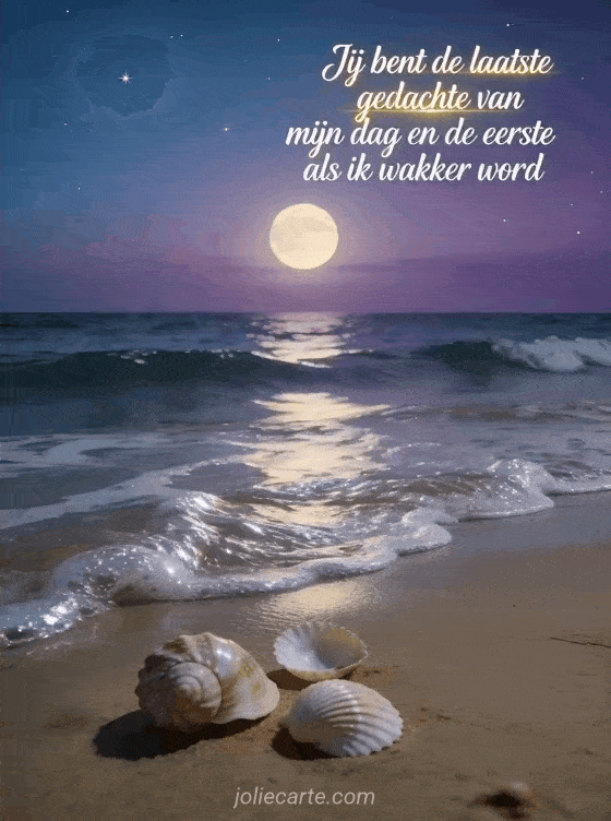 Deel een teder goedenachtgevoel met deze poëtische romantische kaart aan de door maan verlichte oceaan. Bekijk ook afbeelding goedenacht lieverd, liefdesbericht goedenacht of goedenacht lieverd gedicht.