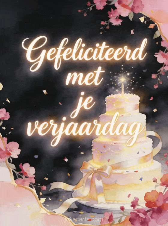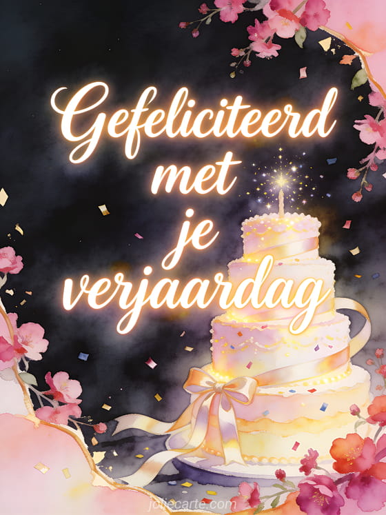 Deel een vrolijke verjaardagskaart met ivoorkleurige kalligrafie, fuchsiabloesem in cascades, een lichtgevende taart met lagen, satijnen linten en sprankelende confetti. De aquarelrand en gelaagde bloemblaadjes geven deze groet een helder romantisch gevoel. Ontdek ook een gefeliciteerd met je verjaardag mijn lief gif, verjaardag verliefd koppel of verjaardag mijn liefste.
