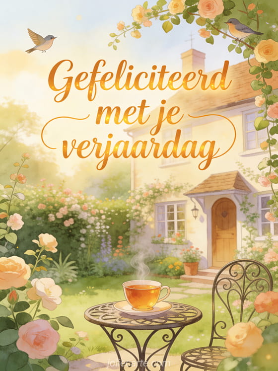 Deel een rustige gefeliciteerd-wens met een kaart vol bloemen, landelijk landschap en dampende thee in zacht goud licht. Bekijk ook gefeliciteerd met je verjaardag bloemen natuur, gefeliciteerd met je verjaardag met coronavirus mondkapje en sms om gefeliciteerd met je verjaardag te wensen.