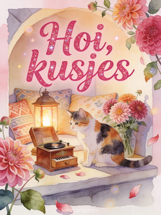 Deel een lieve hoi met frambooskleurige letters, een calico kat, een muziekdoos en dahlia's in een gezellige nis vol kussens. Je kunt ook fijne dag hoi goedemorgen gif, hoi goedemorgen gifs of hoi kusjes geanimeerde gif sturen.