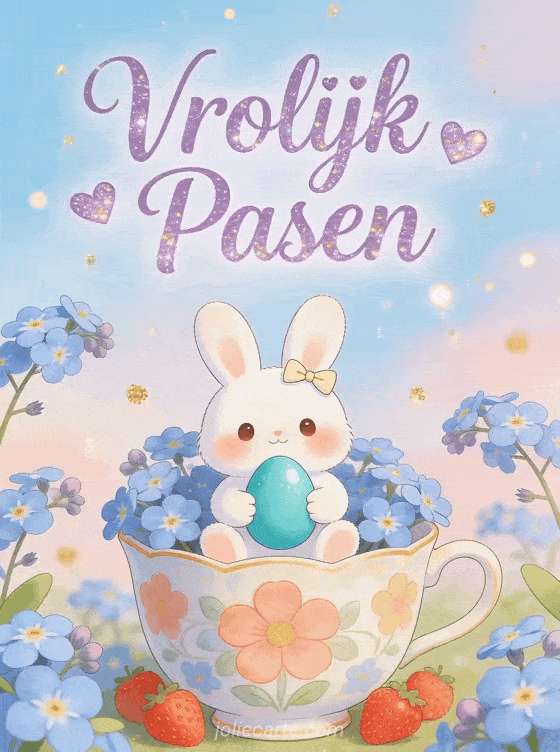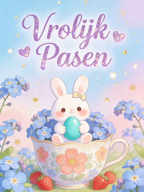 Stuur een schattige paashaas-kaart voor kinderen met een kawaii wit konijntje dat een turquoise paasei knuffelt. Ontdek ook een pasen dieren.