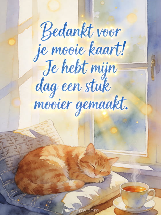 Stuur een warmhartig bedankje voor een mooie kaart die je geraakt heeft. Bekijk ook een je kaart heeft me erg geraakt of een je kaart heeft me erg blij gemaakt.