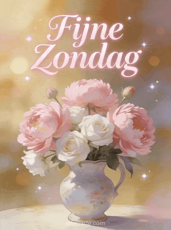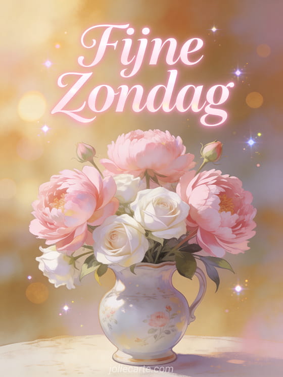 Deel romantiek met deze fijne zondag kaart met een delicaat arrangement van roze pioenrozen en witte rozen in een vintage porseleinen vaas in zacht ochtendlicht. Ontdek ook een kaart van foto's om een fijne zondag te wensen of fijne zondag cocooning.