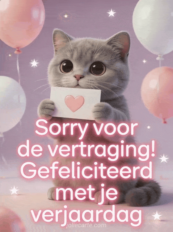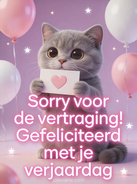 Een grijze Britse korthaar kitten met grote ronde ogen houdt een hartbord vast, omringd door roze en witte ballonnen. Bekijk ook tekst gefeliciteerd te laat verjaardag of gefeliciteerd te laat gif.