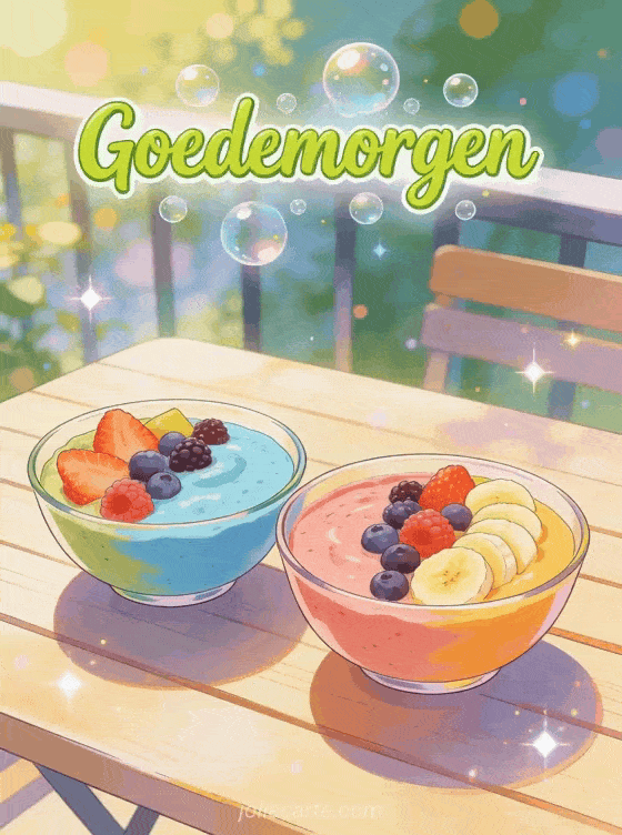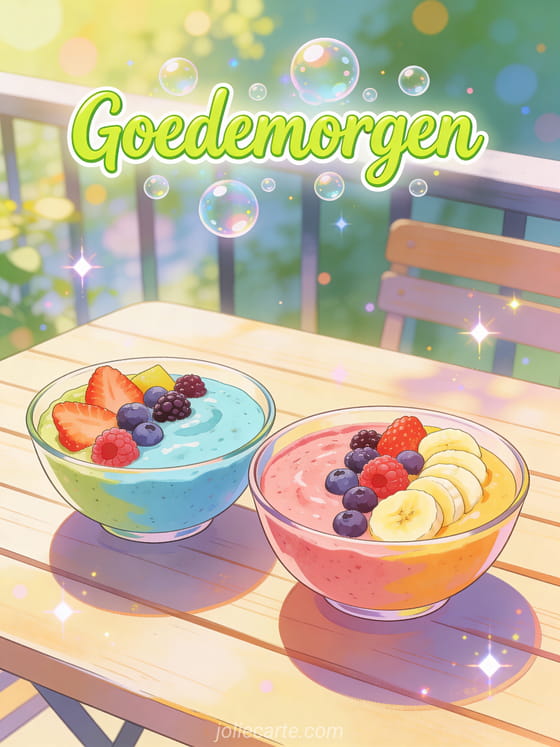 Deel een vrolijke en energieke ochtendgroet met twee kleurrijke smoothie bowls bij een zonnige brunch. Ontdek ook een goedemorgen aan je geliefde kaart of een ochtend goedemorgen kaart.