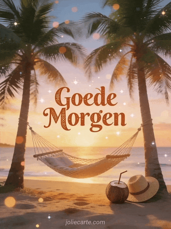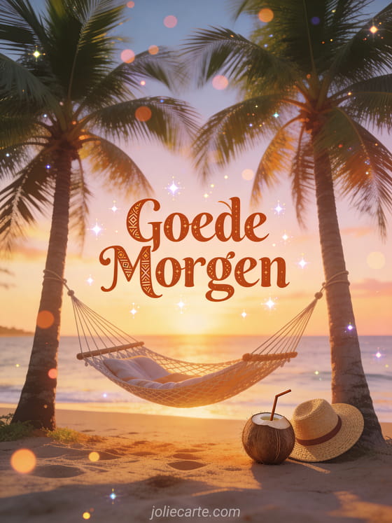 Stuur een dromerige sms om goede morgen te wensen kaart met een gezellige hangmat tussen palmbomen op een tropisch paradijsstrand bij zonsopgang met cocktails en een strooien hoed. Ontdek ook een afbeeldingen goede morgen kaart of een goede morgen kat kaart of een goede morgen afbeeldingen kaart.
