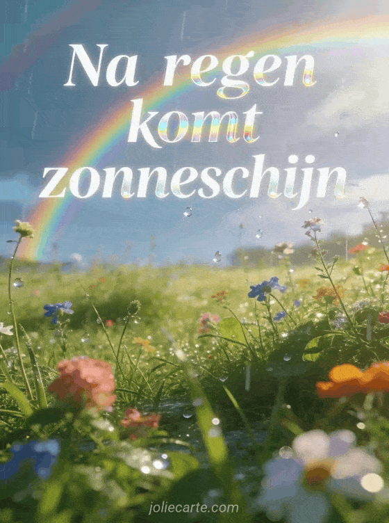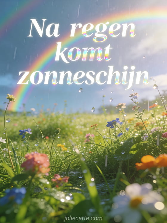 Stuur een hoopvolle en lichte kaart met een groene weide na een bui en een volledige regenboog met kleurrijke wilde bloemen om iemand via sms veel sterkte te wensen. Bekijk ook een en veel sterkte, veel sterkte bloemen of veel sterkte in deze moeilijke momenten.