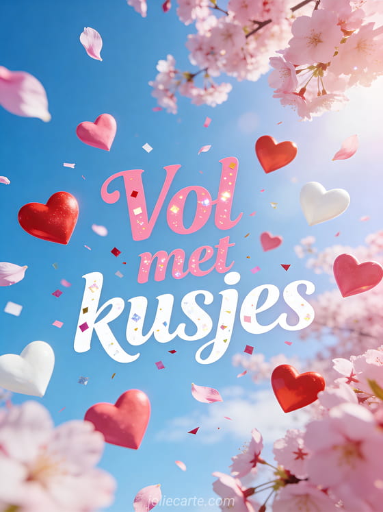 Stuur een kaart vol met kusjes met deze vrolijke kaart vol roze hartjes en kersenbloesembladen die in een lentelucht dwarrelen. Ontdek ook hele natte kusjes of tekening meisje kusjes.
