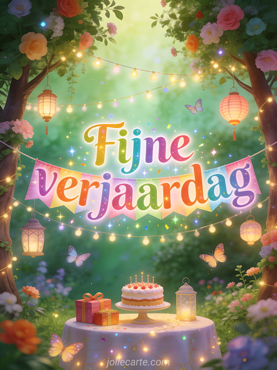 Vier met deze spandoek fijne verjaardag baby kaart met kleurrijke feestvlaggen tussen bloeiende bomen, lichtslingers, vlinders, taart en cadeaus in een magische tuin. Ontdek ook fijne verjaardag baby gif, fijne verjaardagskaart baby en grappig verjaardagsbericht kind.