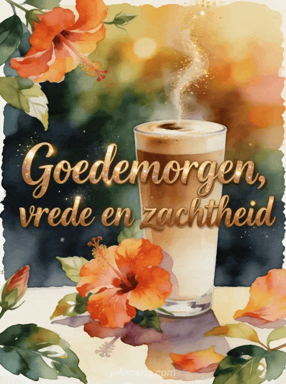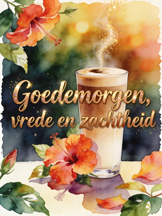 Deel een heldere tropische ochtend met deze aquarelkaart, met een hoog latteglas, levendige hibiscusbloemen, glanzende bladeren en gouden vonken rond de koffiedamp. Bekijk ook koffie goedemorgen mijn liefste, ochtendkoffie goedemorgen of gratis goedemorgen koffie afbeelding.