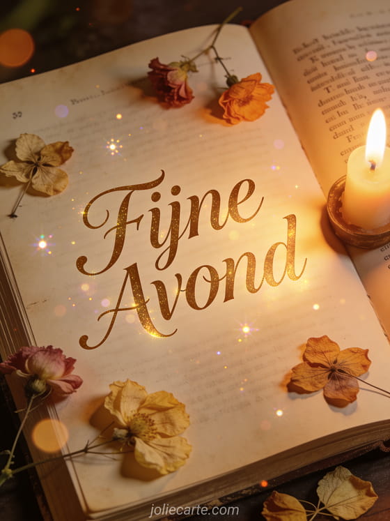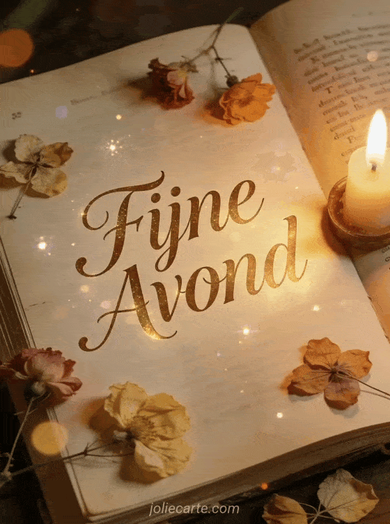 Stuur een prachtige spreuk fijne avond groet via deze gratis wenskaart. Antieke boekpagina's met gedroogde bloemen en warm kaarslicht, een knusse nostalgische sfeer met amber tinten, perfect om een wijze avondgroet te sturen. Bekijk ook een fijne avond gif glinsterende animatie.