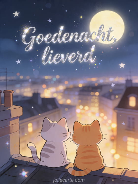 Wens een tedere nacht met deze romantische kaart van twee katten onder de sterren. Bekijk ook romantisch liefdesbericht goedenacht, afbeelding goedenacht lieverd of liefdesbericht goedenacht.