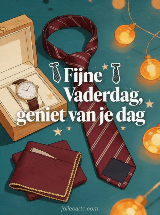 Stuur een stropdas vaderdagkaart met krachtige ivoorkleurige serifletters, mini-stropdasstickers, gouden sterren, een elegante zijden stropdas, houten horlogedoos, gevouwen pochet en amberkleurige lichten. Bekijk ook fijne dag voor papa, een vaderdagkaart stropdas of een fijne Vaderdag papa kaart.