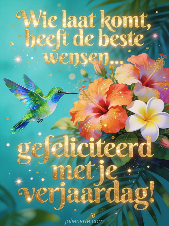 Een prachtige kolibrie met iriserende veren vliegt rond tropische hibiscus en frangipani bloemen met gouden glitter. Bekijk ook gefeliciteerd te laat sorry verjaardag of sms gefeliciteerd te laat.