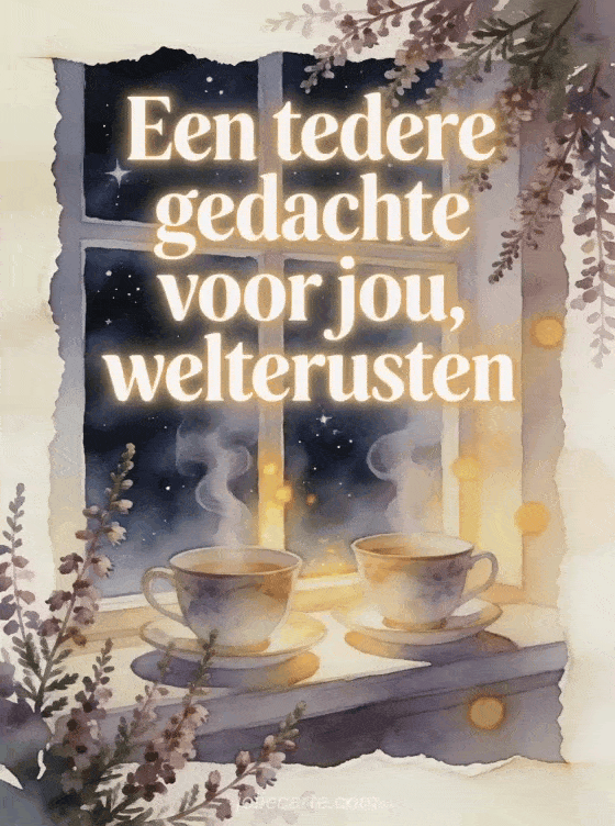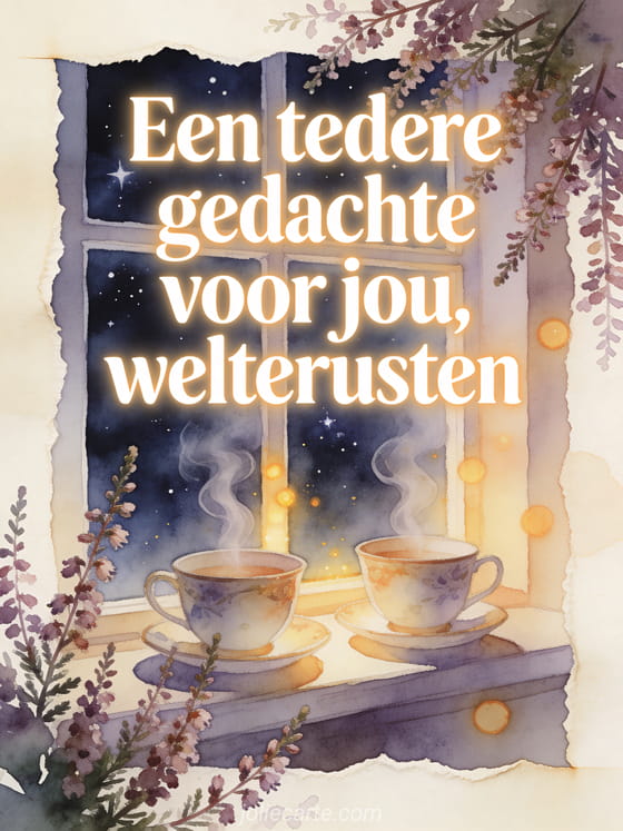 Deel een tedere gedachte en zeg welterusten met twee bijpassende theekopjes, heidetakjes, een gloeiend raam en een sterrennacht. Ontdek ook een welterusten bericht voor je lief, een welterusten virtuele kaart of een lief welterusten bericht.