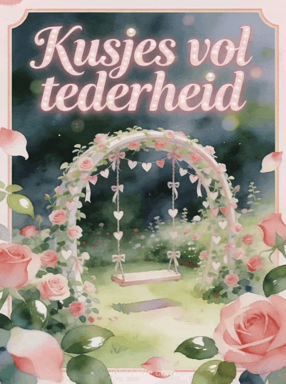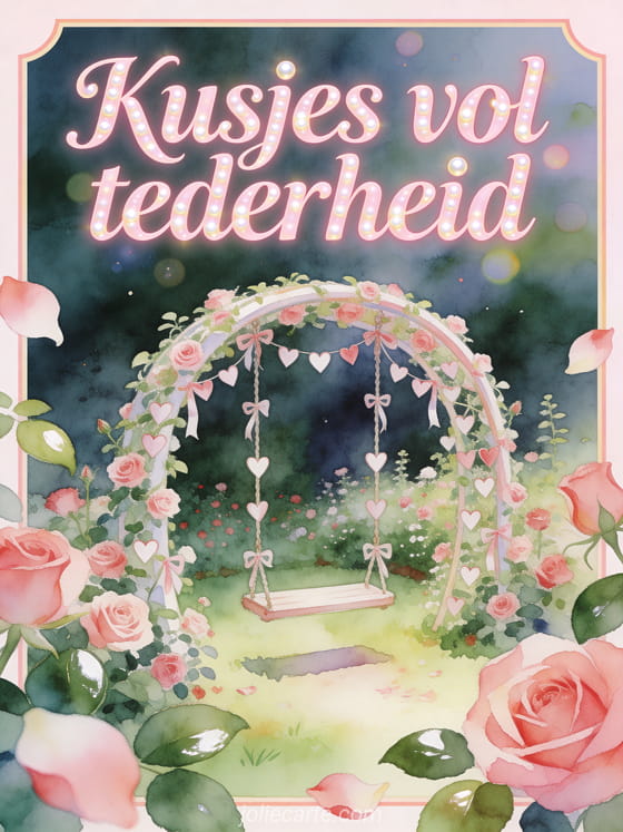 Deel kusjes vol tederheid met een aquarelrozentuin, een gebogen schommel bedekt met kleine hartlinten en stralend romantisch licht. Ontdek ook vlinderkusjes gif, gratis kusjes afbeelding of veel kusjes geanimeerde gif.