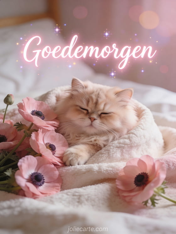 Stuur een warme en tedere goedemorgengroet met een pluizige Perzische kat die een zachte deken knus omarmt tussen roze anemonen. Bekijk ook een goedemorgen gifs of een sms goedemorgen die doet smelten.