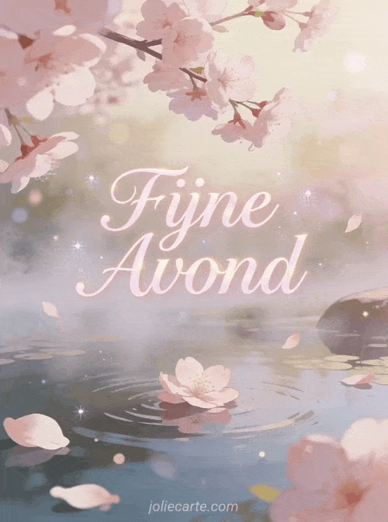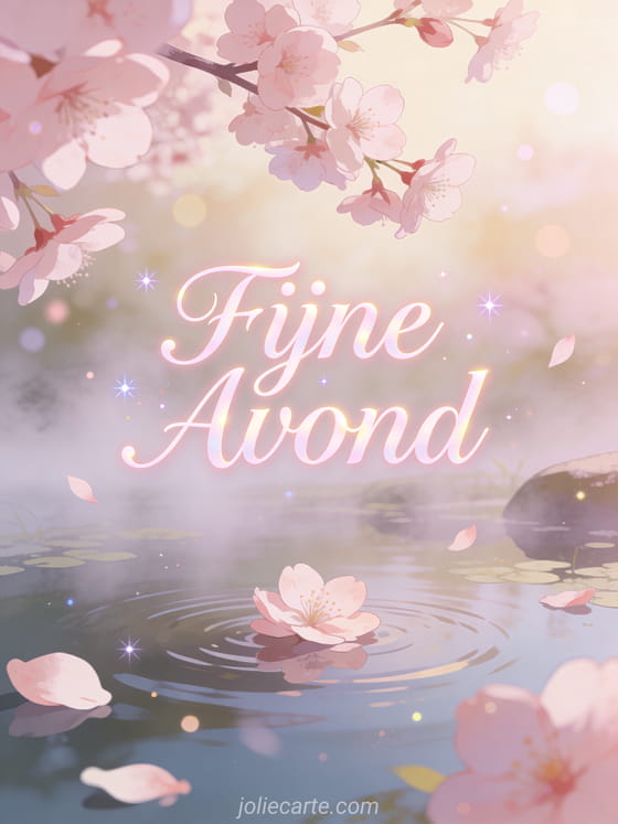 Stuur tedere zachte fijne avond gifs en mooie afbeeldingen via deze gratis wenskaart. Delicate kersenbloesems die drijven over een serene vijver met zachte nevel, een teder vredig sfeer in blossomroze en crème tinten. Bekijk ook een afbeelding fijne avond jpg of een fijne avond kussen.