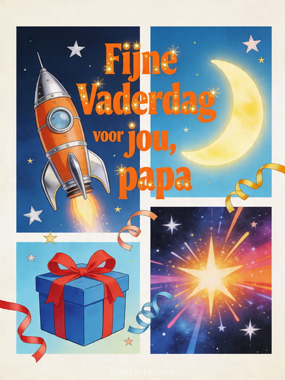 Stuur papa een speelse geïllustreerde Vaderdagkaart met een retro raket, halve maan, blauwe cadeauverpakking en een sterrenhemel vol heldere kleuruitbarstingen. Dit energieke ontwerp past perfect bij een vrolijke groet. Bekijk ook gedicht fijne vaderdag papa vriendelijkheid en tederheid, een vaderdagkaart papa of een gratis Vaderdagkaart.