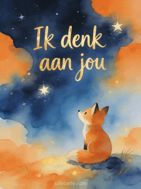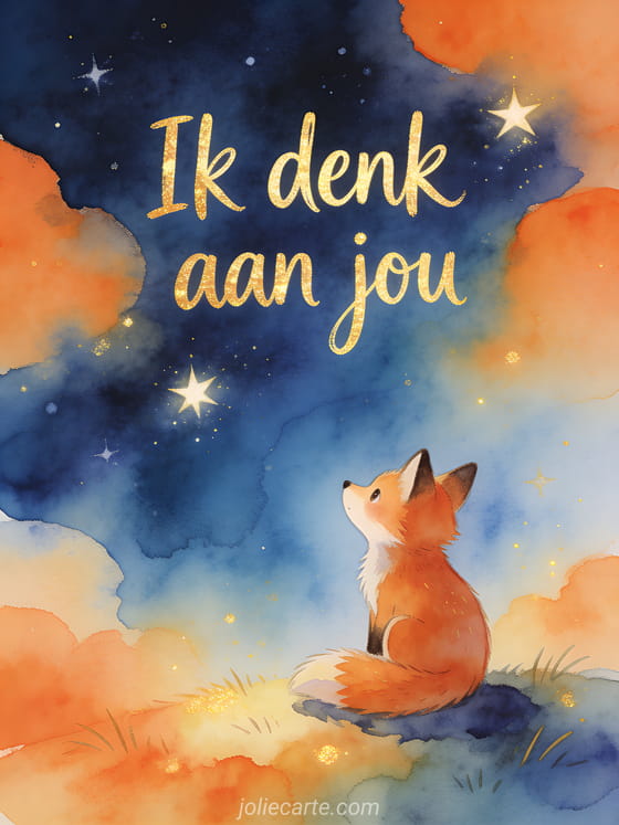 Stuur een artistieke aquarelkaart met een schattig vosje dat naar de sterren kijkt in warme oranje en nachtblauwe tinten om iemand te laten weten dat je aan hem denkt. Bekijk ook een ik denk aan jou vriendin, gifs ik denk aan jou of geanimeerde gifs ik denk aan jou.