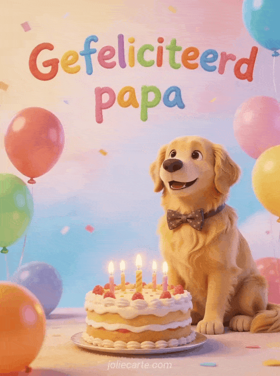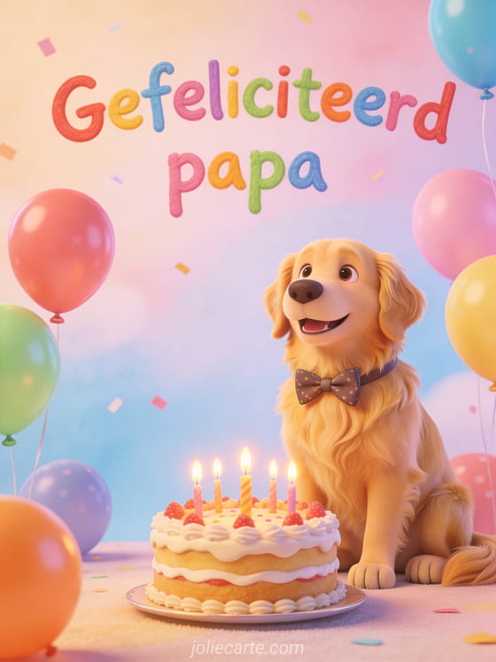Gefeliciteerd papa met deze schattige verjaardagstekening van een golden retriever in een vlinderdas bij een verjaardagstaart met ballonnen.