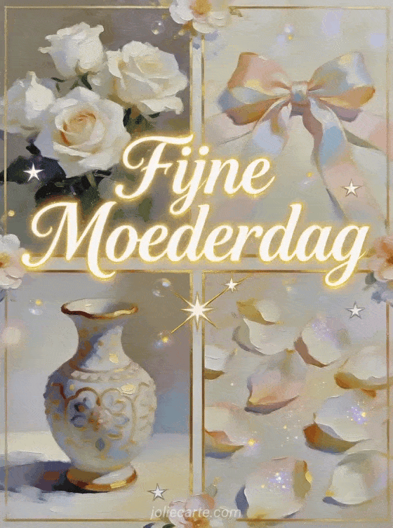 Deel een tekening voor Moederdag in een rijk geschilderde illustratie met vier panelen, witte rozen, een pastelkleurige strik, een decoratieve keramische vaas, sprankelende bloemblaadjes, bloemen en sterren. Bekijk ook gedicht over Moederdag, liefdesgedicht voor Moederdag of Moederdag gedicht.