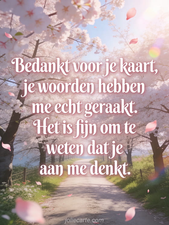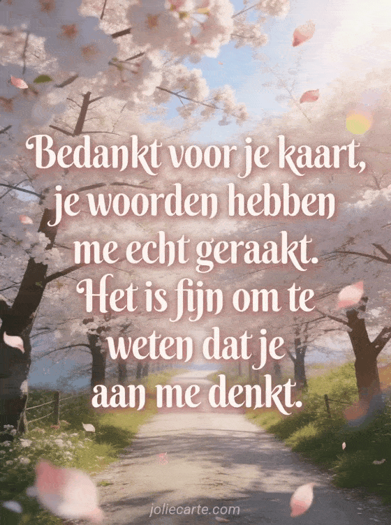 Stuur een prachtige tekst om iemand te bedanken voor een kaart die je geraakt heeft. Bekijk ook een bedankt voor je kaart dat deed me plezier of een bedankt voor je lieve kaart.