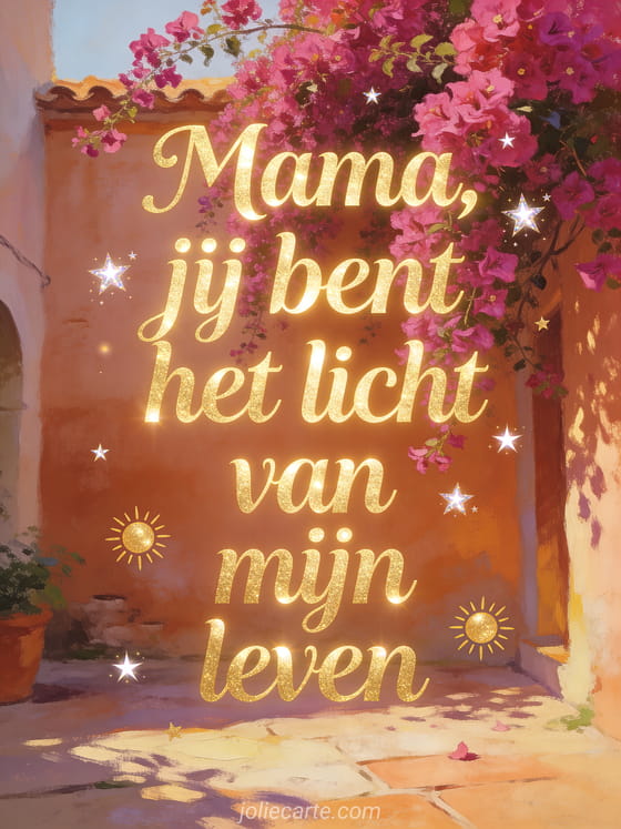 Zeg mama dat ze het licht van je leven is met deze prachtige moederdagkaart met stralende champagnegoud lettering en Bougainville. Ontdek ook fijne moederdag afbeeldingen of het is moederdag.