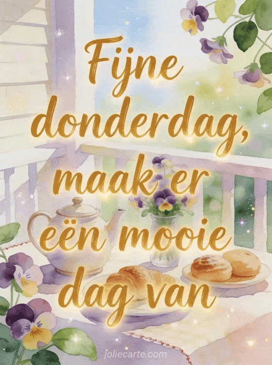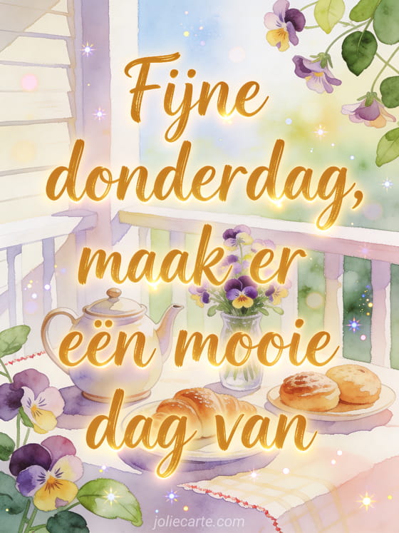 Wens fijne donderdag en een mooie dag met een gezellig ontbijt op de veranda, een keramische theepot, vers gebak en viooltjes in helder ochtendlicht. Deel deze welwillende kaart en ontdek ook fijne donderdag kusjes gifs, fijne donderdag geanimeerde gif of fijne donderdag hartjes afbeeldingen.