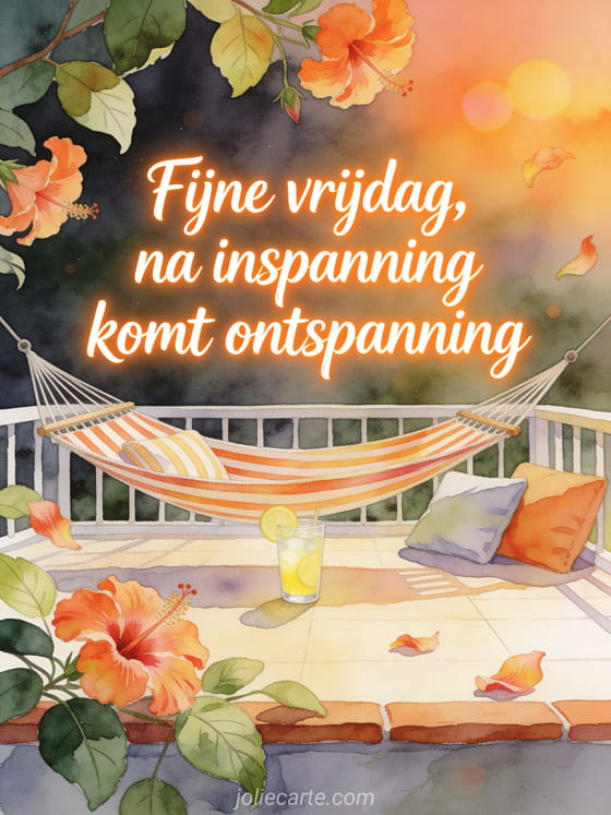 Wens een rustgevende vrijdag met zonsondergangoranje letters, hibiscusblaadjes, een rustig terras, een gestreepte hangmat, limonade en warm licht. Ontdek ook fijne vrijdag vlinder afbeelding, fijne vrijdag geanimeerde afbeeldingen of een fijne vrijdag geanimeerde gif afbeelding.