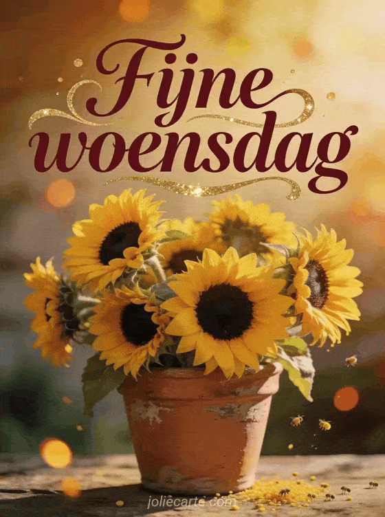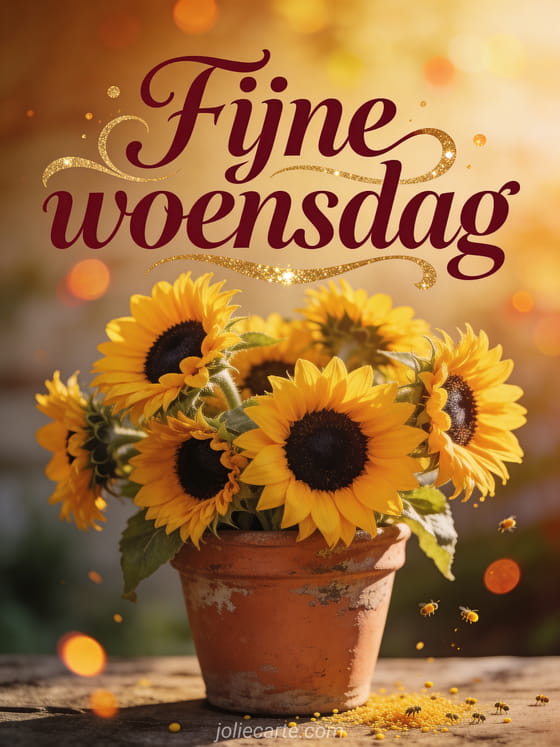 Stuur een warme fijne woensdag groet met zonnebloemen in een rustieke terracotta pot, gouden zomerlicht en zachte plattelandscharme. Ontdek ook fijne woensdag met dieren, goedemorgen fijne dag fijne woensdag of geanimeerde fijne woensdag afbeelding.